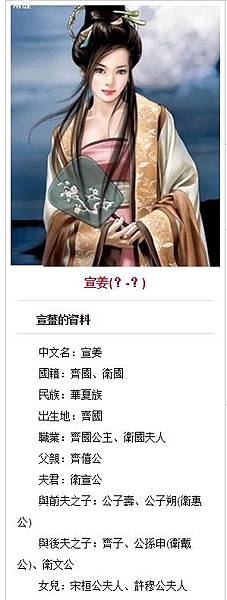 宣姜是個美人,中國春秋時代衛國君夫人,齊僖公的女兒。宣姜的宣字說明他是衛宣公的夫人,姜字是齊國的國姓,宣姜就是衛宣公夫人姜氏 @ 姜朝鳳宗族 :: 痞客邦 PIXNET :: - http://goo.gl/5TaiTn