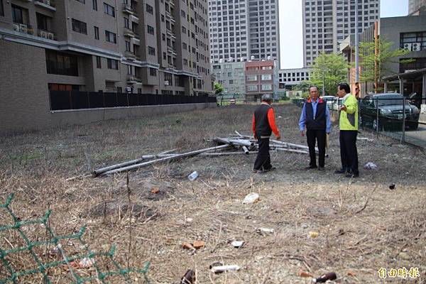 新竹縣農會常監陳清鏡(中)帶著民進黨籍縣議員張珈源辦公室主任徐源發(右)實勘他在高鐵新竹站附近的配回地周邊根本仍是一片荒蕪,沒有任何商業活動。(記者黃美珠攝)
