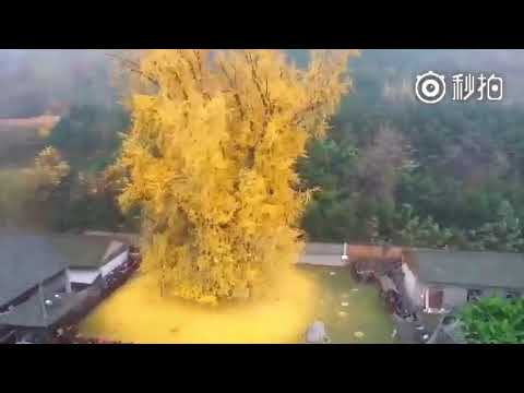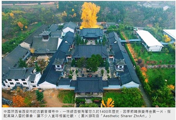 陝西西安市谷觀音禪寺內有一顆擁有1400年歷史的銀杏樹,相傳為唐太宗親手栽種,自11月中旬開始銀杏的黃葉開始凋落散落地上,宛如鋪上一層黃金毯,美麗的景色吸引遊人絡繹不絕前來。