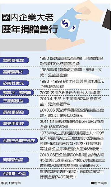 除個人身後財產規畫,企業界在天災人禍時亦慷慨解囊,像是日前八仙塵爆,包括台塑、鴻海、聯發科、華碩、宏碁、廣達、緯創、富邦金、國泰金、新光金、中壽、統一、台泥、王品等知名企業紛紛慷慨解囊,捐贈金額自200萬至3000萬不等。