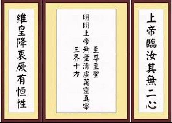 「明明上帝無量清虛至尊至聖三界十方萬靈真宰一貫道的佛堂在陳設中點有一盞油燈代表明明上帝或無生老母