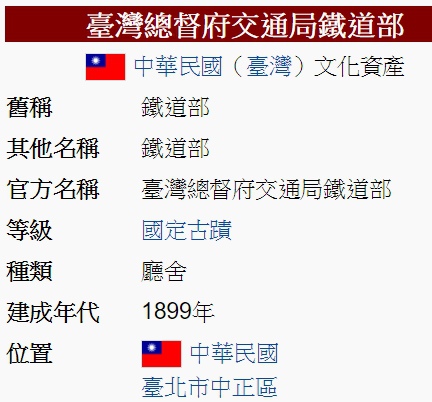 位於台北市北門附近的台灣鐵路管理局舊廳舍,日治時期即為鐵道部辦公場所。原公告指定為三級古蹟,目前名列為國定古蹟。