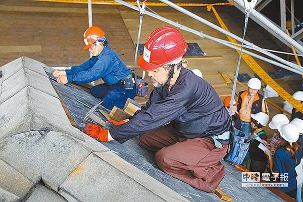 來自日本東北的國寶級匠師佐佐木信平與多位專家學者,應台灣博物館之邀來台協助鐵道部古蹟修復,14、15日帶領台灣匠師與學員,親自示範鐵道部塔樓的石板瓦屋頂修復,68歲的佐佐木俐落身手與認真態度,令人欽服。