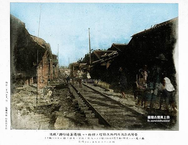 1895年9月日本已控制臺灣北部並留下珍貴影像。圖為當時臺北北門外大稻埕區域,劉銘傳建設之鐵道行走轎子影像數位上色。