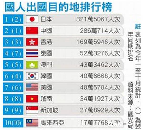 日華旅行社總經理林承瞱指,統計數據也包含出國洽公人次,近年台商出走大陸,台幹在大陸的人數也變少,也可能影響排名表現。