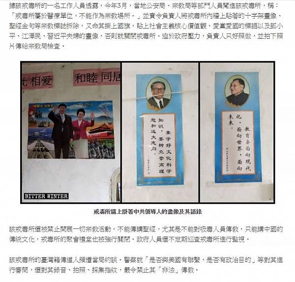 不僅如此,《寒冬》表示,戒毒所一切宗教活動皆被禁,只能談中國傳統文化,強行關閉聚會禮堂,政府人員不定期巡查監視。文中指出所內有台籍傳道人遭當局約談,審問其是否與美有聯繫或有政治目的、嚴禁非法傳教,並錄音拍照採指紋。