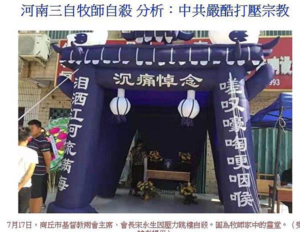 〔即時新聞/綜合報導〕北京政府對於宗教的管制近年越發嚴厲,不僅法輪功,基督教會也遭中國政府打壓。河南牧師宋永生因不滿北京對宗教的控制,心力交瘁,週三(17)於辦公室輕生,遺體今日火化,得年54歲。