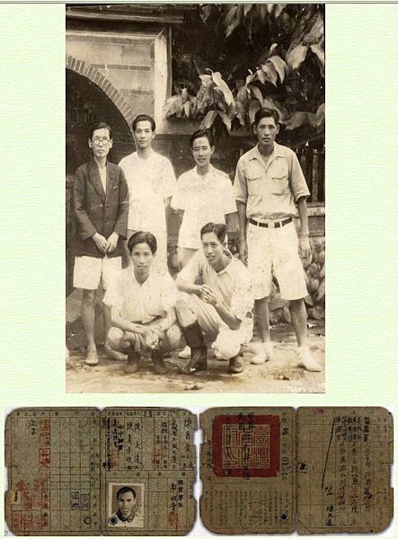 在第一張身分證尚未出現前,老百姓皆使用戶口名簿,然戶口名簿卻有諸多不便。因此民國四十二年(1953)開始製發身分證,身分證上要貼上照片,可不簡單。當年相機是侈奢品,不若今日數位相機普遍,拍照總是婚喪喜慶場合才有的事。要請百姓自行去照相館拍照,簡直登天還難。大甲鎮公所就與鎮內各相館談妥,安排時間,請里內百姓到各里集會所、廟宇或公共場合集合,由相館人員為其拍照,以節省時間、簡化事務,費用由百姓自行支付。遇到「散庄」的百姓,照相館還要登門為其照相,真是服務到「家」。民國四十三年(1944)大甲鎮民終於有了第一張身分證。是否好奇誰獲得大甲鎮第一號的身分證?是鎮長?代表會主席?或者地方首富?都不是,據李清芬說,首號的身分證由當時的業務承辦員林榮先生「很自然」的取得。民國三十五年(1946)六月二十一日「戶籍法施行細則」中規定「國民身分證,應載明姓名,性別…並黏貼照片或指紋…」因此當時的里戶籍員,需挨家挨戶的去建立「指紋」檔案。郭炭說,並不是如今日所理解的按捺指紋,而是用○×來記錄雙手指紋上的紋路,螺紋記○,畚箕則記×。圖為民國三十六年(1947)負責此項業務的大甲鎮公所里戶籍員們,在金華寺一隅合影留念。前排右起林榮、林泗濱,後排右起林流沛、郭炭、黃仲建、李炳坤。其中郭炭、黃仲建及林泗濱在日本實施徵兵制前,皆以軍屬(傭兵)的身份,調往緬甸,駐紮編在日軍「緬甸方面軍司令部」。昭和十九年(1944)九月,日本正式對臺灣人實施「徵兵制」,第一批以大正十四年(1925)出生為對象,林泗濱及黃仲建剛好是那年出生,便立即以「現地徵兵」之名,調往泰國服役,而郭炭因為大正十三年(1924)出生,則一直在緬甸「服役」。光復後,郭炭也無船立即回臺灣,民國三十五年(1946)春天才在美軍的協助下,用船將留滯緬甸的臺籍兵送回故鄉。郭炭先生說,有次與公所同仁張柏齡(外省籍)談到在緬甸的某次戰役中,日軍與中國部隊在一座橋的兩端僵持對峙,極可能一觸即發,後來不知為何並無對殺而撤離。談起來才知當時的代表日軍的郭炭,與效忠中國的張柏齡,分別在橋的兩岸為彼此的國家盡忠效命。在命運之神的帶領下,後來竟成同事,並同在大甲鎮公所屆齡退休。