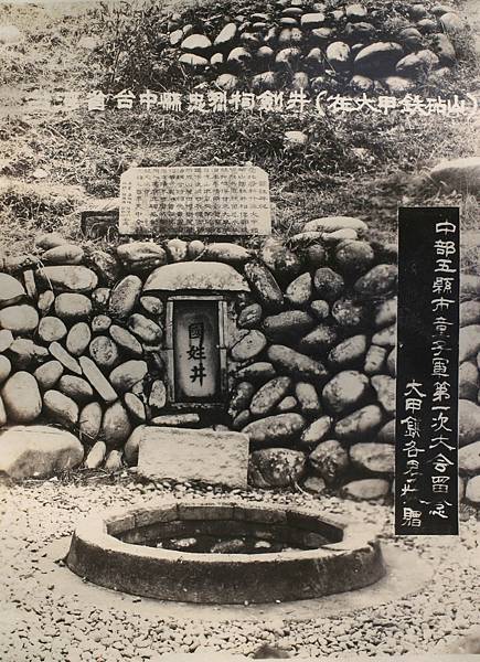 民國四十一年(1952),中部五縣市童子軍第一次大會在彰化八卦山舉行,大甲鎮各界拍攝鐵砧山景點照片贈送,有國姓井(今劍井)、及孔子紀念碑二種,藉以推銷大甲觀光,帶動地方經濟繁榮,值得敬佩。圖中的國姓井仍保有清代遺風,變化極微。今日所見至少已歷經三次整修,並在四十二年(1953)由于右任親書「劍井」兩字後,國姓井之名漸被取代、淡出大甲人的記憶。孔子紀念碑係民國三十八年(1949)八月二十七日,鐵砧山腳望族許天德先生,為紀念孔子誕辰二千五百週年而書立於鐵砧山上。當年「孔碑夕照」為鐵砧山八景之一。「孔碑」於民國八十三年(1994)教師節當天發現遭竊,民國九十一年(2002)六月三十日吳朝龍先生尋獲,現移立於大甲文昌祠