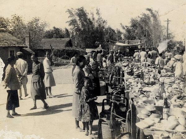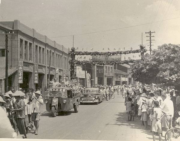 圖為李雅正省議員、及朱江淮建設廳長,拜謝隊伍來到大甲南門口,兩旁居民夾到歡迎,兩人站在三輪改裝「敞蓬車」上向民眾揮手致謝的情景。道路上歡迎門的位置,約為建於清道光七年(1827)大甲石城,南門的位置。圖左六連棟二樓街屋,昭和十年(1935)五月十七日竣工落成,為庄美人黃直發所建。其中益記青果鋪旁的斜屋頂建物,為今「上海三六九肉包店」,右上電線桿後方約為今第二市場。