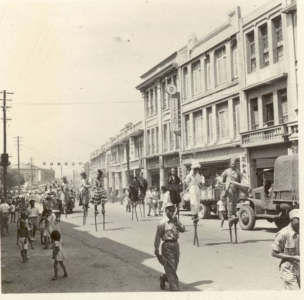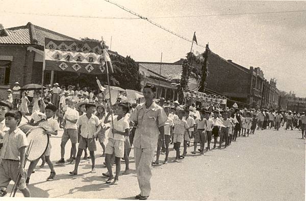 圖為李雅正省議員、及朱江淮建設廳長,拜謝隊伍來到大甲順天路三角街前。隊伍前方由踩高蹺前導,今日已難再見此景。當時順天路只中間鋪設柏油路面,車輛稀少,道路感覺好寬廣。左邊幾位兒童又驚又喜摀著耳朵看熱鬧。圖右聖和西藥房已遷至南門口,其隔壁臺灣合會儲蓄股份有限公司大甲分公司,為今座落在鎮政路上臺灣中小企銀大甲分行的前身,現在則為大甲鎮農會順天辦事處。從同個角度觀看,除了招牌雜參差雜亂外,「昭和樣式」街屋幾無改變,仍保持日治時期的風貌