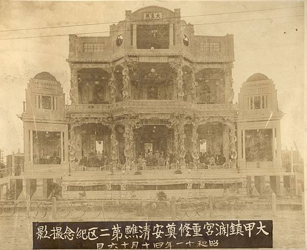 昭和十一年(1936)大甲鎮瀾宮為慶祝重修落成,以及昭和十年(1935)「墩仔腳大地震」,大甲一切平安,而舉辦祈安清醮大典。第二區醮壇「大主醮」,設在富都戲院一帶,經費由大甲二保、山腳、外埔庄(大甲東、馬鳴埔、鐵砧山腳、土城、內水尾、六分…)等一帶信徒敬奉。此圖應為醮壇建成後,地方人士於醮壇上合影留念。雖照片年代已久,仍可看前排中間者為大甲名望之士杜清先生、其左二為何永先生;約月餘,杜清先生於十二月六日辭世,享年六十九。