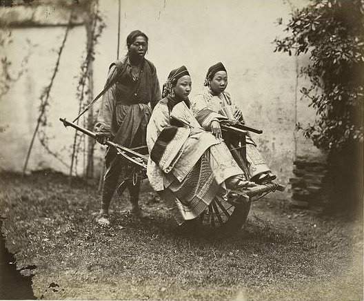 此 圖像轎子的,題為“新娘在她的途中婚禮,福建福州中國”,新娘頭蓋像鐵鍋或竹籠