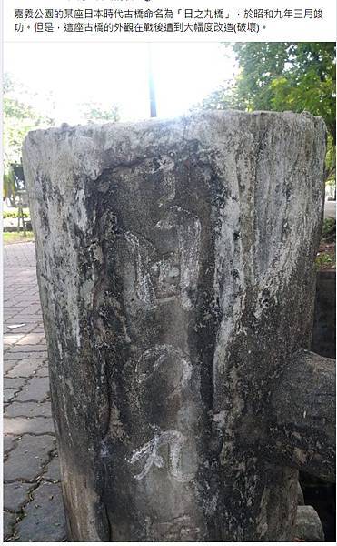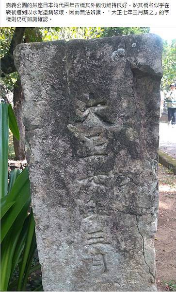 蔡京陽 - 嘉義公園的某座日本時代百年古橋其外觀仍維持良好,然其橋名似乎在戰後遭到以水泥塗銷破壞,因而無法辨識,「大正七年三月築之」的… | Facebook