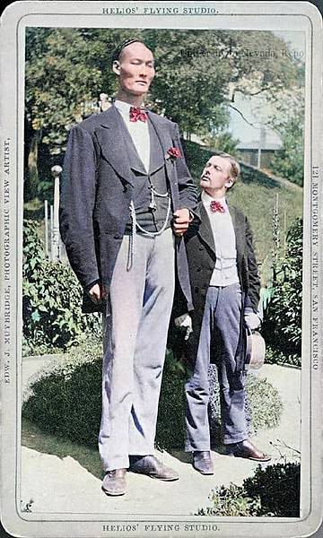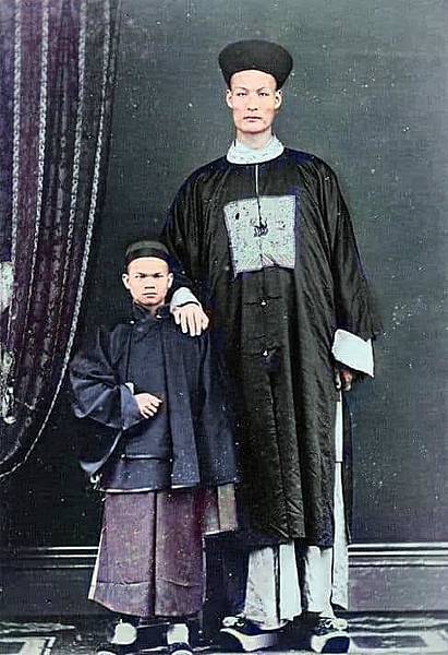 1880s年香港,130多年前,世界史上最高人「詹世釵」途經香港去英國,在香港影樓拍攝照片。世界第一高人:清朝巨人「詹世釵」生於1846年,卒於1893年11月5日,其身高高逾8英尺有多 ( 江西省婺源縣浙源鄉虹關村人),通曉多國語言,因身長被美國人重金聘請,周遊世界表演,經香港後入英國籍,爾後因經商而於英國長期定居,並娶當地英國婦女為妻,育有一子詹澤純,晚年卒於當地。其子曾於英國駐上海領事館工作,不過並未遺傳到其父親的身高。
