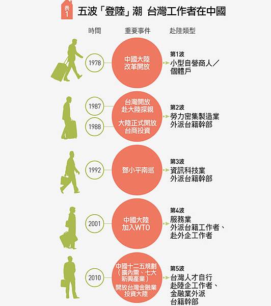 雖然台灣人才西進中國,從一九八八年開始至今已近三十年,但這些年,西進範圍從原本的傳產、製造業、科技業,擴展到現在的服務業,工作者絡繹不絕。(見表一)