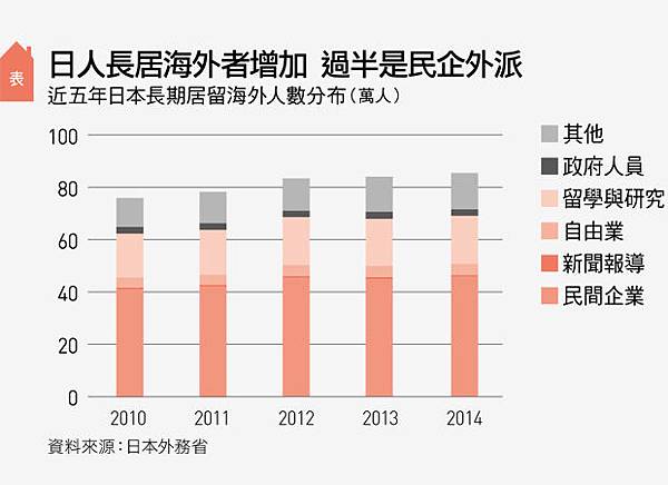 去年,日本居留海外超過3個月以上的總人數約85萬,其中過半是民間企業派駐員工。(見表)