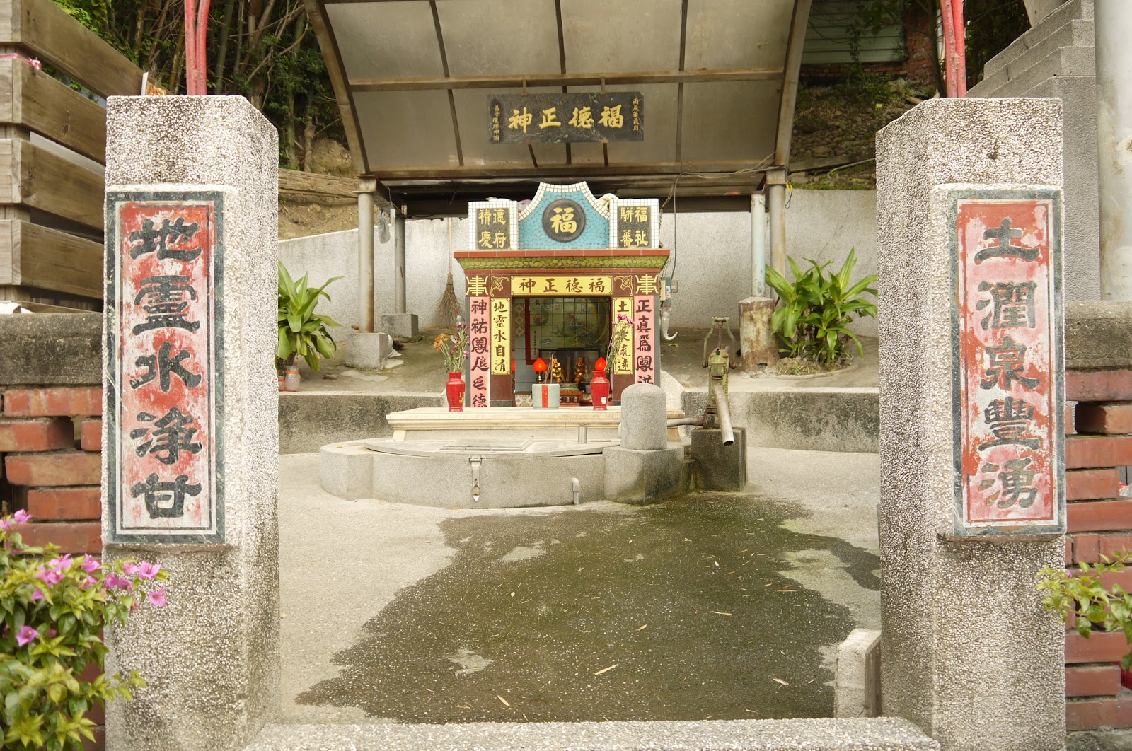 這處地下水源,歷經近四百年的汲取,竟未枯竭,至今井口周圍還架著幾台抽水馬達汲水提供附近居民生活使用。水井上方的圓拱形護體, 完工於1935年,為日本人興建做為防範空襲之用。