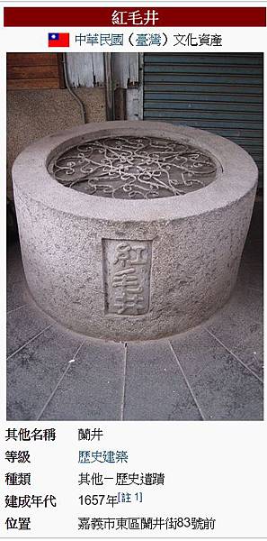 紅毛井 、紅毛埤 和王田是荷蘭人在諸羅山社及周邊經營的遺跡。以時間來看,紅毛井 最早,而且鄭氏將領吳智武曾予重修,康熙五十三年(1714年)到任的諸羅縣知縣周鍾瑄在他主修的《諸羅縣志》提到:“紅毛井 ,在縣署之左。開自荷蘭,因以名。方廣六尺,深二丈許,泉甘洌於他井,相傳居民汲飲是井,則不犯疫癘。鄭氏時,有吳智武者鎮守斯地,重修之。”從前面的附圖裡,很清楚的看到紅毛井 不但在縣城之內,而且位於縣署之東。