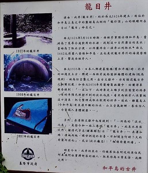 其實上段諸羅縣志的記載有些亂掉了,龍目井是1626年西班牙佔領時期所開鑿的,因為位處和平島龍仔頂山的位置,所以稱為龍目井