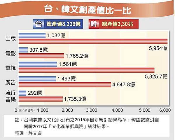 根據我文化部「2016文化創意產業發展年報」,2015年台灣文創產值僅8339億元,不到南韓三分之一,而韓國傲視全球影視音產業,加總即達8826億台幣,相當台灣全部文創產業產值;而南韓文創外銷年產值新台幣2032億元,亦狂勝台灣890億元。