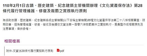 110年2月1日古蹟、歷史建築、紀念建築主管機關辦理《文化資產保存法》第28條代履行管理維護、修復及裁罰之實務執行原則