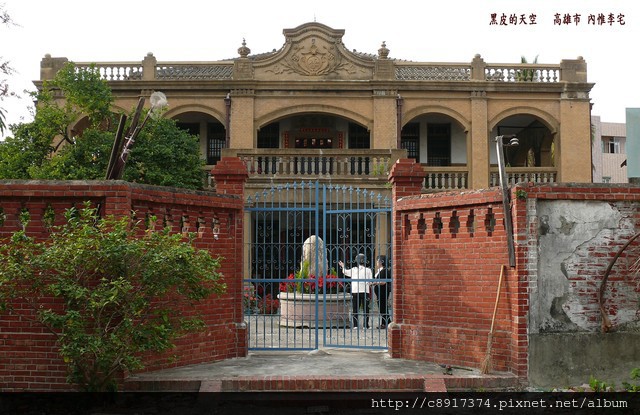 | 歷史沿革 | 內惟李氏家族乃中國浙江省松江府人,李勇為渡台始祖。至第七代李榮經商致富,同時也是地方要人,曾擔任內惟區保正15年,信用組合理事、高雄州委員、水利委員等。李家古厝就是李榮於昭和6年(1931)興建,而與著名的陳中和洋樓並列高雄市南、北兩大風格獨特的洋樓。在空間組織上,李宅是完全對稱的格局。中軸線上為主廳及突出的門廊,四周並繞以拱廊。在造型方面,門廊的西方式樣柱頭及圓弧形山牆是一大特色,另外,不僅迴廊本身是種空間格律,圓拱亦為一類造型語彙。 由於此棟西洋式建築在細部裝飾上並不華麗,簡樸反而成為另一種特徵,十三溝面磚等建材的使用也反應出當時的時尚。 宅第為巴洛克式造型二樓洋房,在空間組織上是完全對稱的格局,中軸線上為主廳及突出的門廊,四周並繞以拱廊,外觀洗石子,圍牆貼小口磁磚,廳堂內部擺飾古色古香。 |