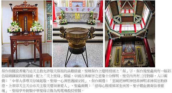 祭台前擺設香爐乃是天主教允許敬天祭祖的具體措施,聖壇祭台上還特別刻上「祭」字。祭台後聖龕尚有一幅彩色磁磚鑲嵌的聖母圖,配上「天上聖母」橫匾,中國古典廟宇之意象十分鮮明。聖堂內共有三付對聯,入口兩側:「中華大孝尊天存誠起敬,聖母一心濟世護國安民」、祭台兩邊:「至誠祀神明神怪非神明求神莫忘勤修德,上帝即天主天公亦天主敬天還須兼愛人」、聖龕兩側:「慈母心腸垂憐眾生疾苦,聖子體血養育信者靈魂」。聖母亭外銅製中華聖母立像為馬電飛教授塑製。