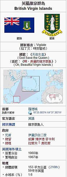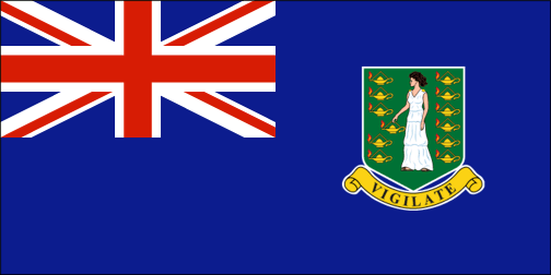 英屬維京群島為英國海外領地,旗幟以英國政府船旗為底,右方放置紋章。維京群島之名由航海家哥倫布所定,此處島嶼數量眾多,他便依據基督教聖人聖烏蘇拉(吳甦樂)帶領一萬一千名處女侍從前往羅馬朝聖的故事以「處女」(Virgin)命名之。英屬維京群島紋章中手提油燈的白衣女子便是聖烏蘇拉,周圍的十一盞油燈代表那一萬一千名跟隨者;底部的飾帶用拉丁文寫著銘言「警戒」。