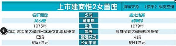 【詹宜軒╱台北報導】「如果公司付我薪水,是要我附和、奉承董事長的話,那他們買一隻鸚鵡就好。」身著雪紡上衣、俐落長褲,總太地產月初新上任董座翁毓羚「霸氣」地說。身處99%為男性當道的營建業,除翁毓羚外,名軒開發董座吳泓瑩,同樣「以柔克剛」帶領公司向前衝,而她們,甚至不約而同都是6年級生。