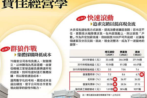 值得一提的是,雖然旗下有七十幾家建設公司,但所有的建材均採聯合採購方式進行,加上寶佳推案量又非常大,龐大的採購規模,讓寶佳蓋屋成本得以比同業低許多。一位寶佳供應商說:「與同樣經營首購市場的同業相比,寶佳可再壓低一至二成的成本。」