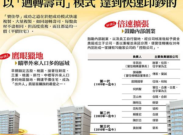 國內建商多以家族式經營,以大量購地或轉投資擴大企業規模,寶佳採取「內部創業、利潤分享」的經營模式,是國內地產商少見的成功模式。