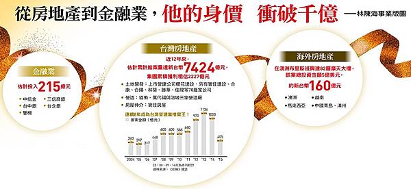熟識林家的金融業人士指出,林陳海大買金融股,目的不在於經營權,而是在為其龐大資產尋求避險。「營建業對利率都很敏感,目前利率已經跌無可跌,在美國聯準會未來可能啟動升息循環之下,或許這次的升息會走得很緩慢,但畢竟,升息就對營建業與房地產業不好,對金融產業有利。」「加上金融股又是高度監管的產業 ,獲利不錯、配息又穩定,林陳海會有這樣的資產配置動作是很聰明的。」
