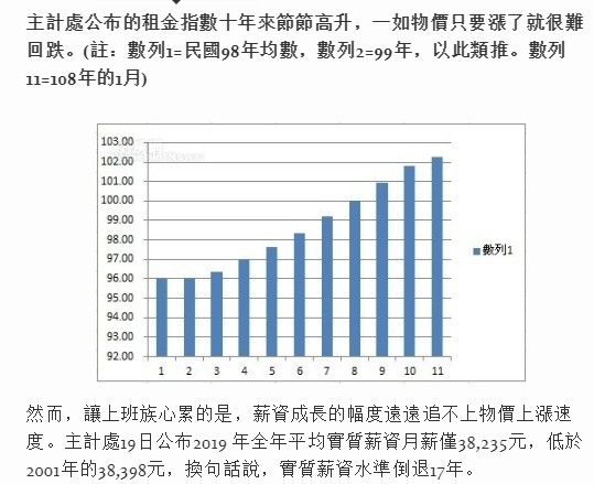 過去39年僅成長71.75%,2011~2019僅成長6.58%,這就是主計總處調查製作,嚴重失真到主計長都不知道主計總處有這項業務的房屋租金指數。