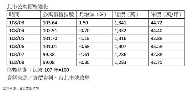 公寓價格表現仍軟,8月指數99.08,連續五個月下跌,連兩期跌破基期100,為2012年實價登錄上路以來最長跌勢,不過跌幅還好,五個月總計下跌約4.5%,目前單價42.7萬元,為去年7月以後新低。