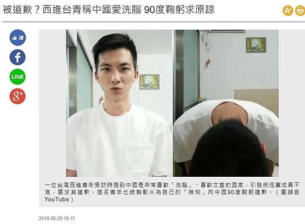分享被道歉?西進台青稱中國愛洗腦 90度鞠躬求原諒到Facebook 分享被道歉?西進台青稱中國愛洗腦 90度鞠躬求原諒到Line 分享被道歉?西進台青稱中國愛洗腦 90度鞠躬求原諒到Google+
