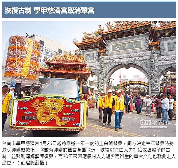 (中國時報)恢復古制 學甲慈濟宮取消輦宮 - 中時電子報 - https://goo.gl/P6Jpjh