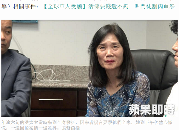 年逾六旬的洪太太當時嚇到全身發抖,因來者揚言要殺他們全家,她到下午仍然心慌慌,一邊回憶案情一邊發抖。張紫茵攝【LA直擊】他踢爆淫貪活佛詐遍全球華人 遭威脅「殺光全家」 | 即時新聞 | 20170718 | 蘋果日報 - https://goo.gl/ybg2V1