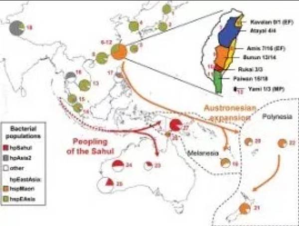 一、南島語族 HpMAORI (幽門桿菌毛利型):存在台灣高山原住民及南島語族的胃部,但漢人、韓國人、日本人及中南半島族群則沒有。陳耀昌透過「細菌人類學」,運用人類胃裡的幽門桿菌 DNA 之排序找出人類遷徙的足跡,並發現台灣高山原住民是南島語族的祖先。
