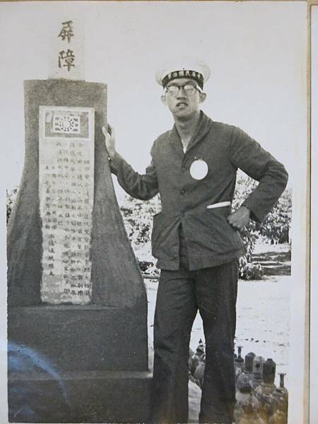救國團「南疆遠航隊」的重要任務之一,是在島上立一個刻有所有南沙學員名字的石碑。林鈺祥與刻有自己名字的紀念石碑合影。(林鈺祥授權提供)