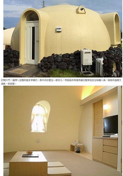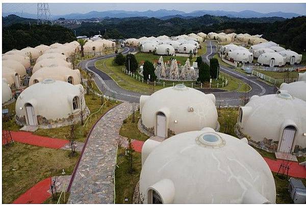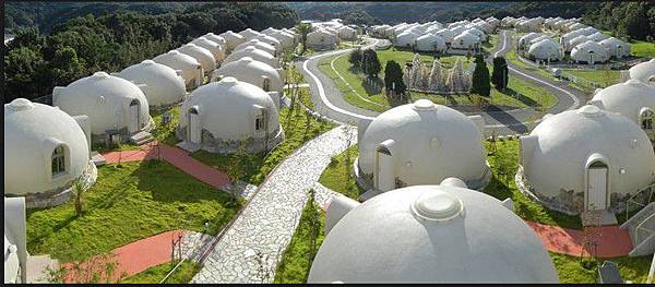 以厚度約20CM的特殊發泡苯乙烯樹脂為建材製作的半球形房子,內部空間約40平方米,裡面有衛浴、空調,輕巧無柱的設計,在大地震時反而卻十分耐震。