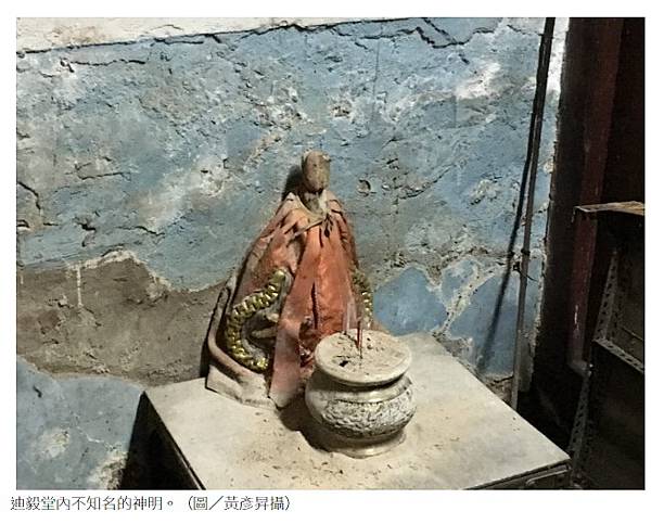 記者實地走訪,迪毅堂雖鄰近捷運府中站的精華地段,但廟堂藏於房舍間,從外經過看不見任何明顯指標,難以察覺有個珍貴古蹟藏身於此;迪毅堂內部不論屋頂或牆壁,都嚴重斑駁、破損,匾額字跡也模糊難認,斷樑、蜘蛛網遍布,保存現況堪虞。