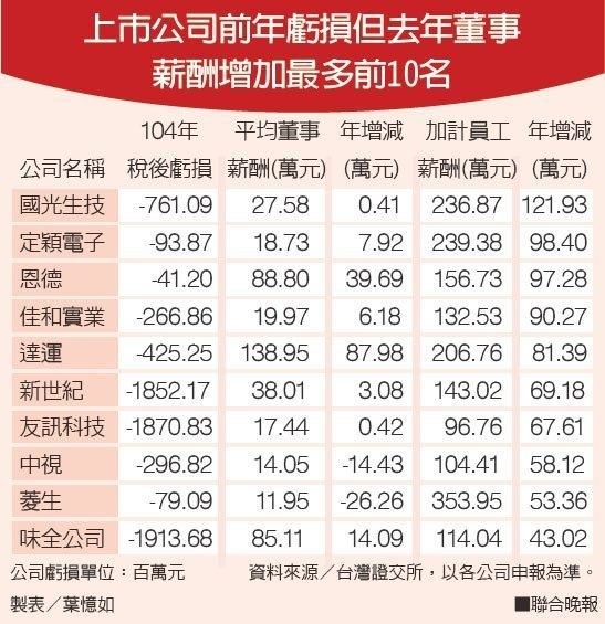 據統計,國光生技、定穎電子、恩德、佳和實業、達運、新世紀、友訊科技、味全、達能、大同、燁興、麗嬰房、亞太電信、聯成、冠軍等企業,雖然104年虧損,但不僅董事酬金增加,員工薪資也增加,中視、菱生是董事酬金減少但員工薪資仍增加,為平均加薪金額都在30萬元以上的公司,因此被證交所公布在公司治理專區,總計上市櫃有超過203家公司虧損仍照樣自肥公司。