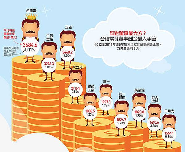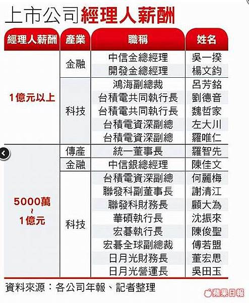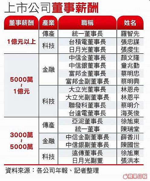 證交所統計資料顯示,2014年上市公司董事酬金前十名,包括台積電、中信金、統一超、正新、大立光、寶成工業、英業達、巨大機械、日月光及統一等。觀察該十家公司,科技公司計有台積電、大立光、日月光及英業達等四家,其中前三家科技公司都屬蘋果(Apple)公司的主要供應廠商。