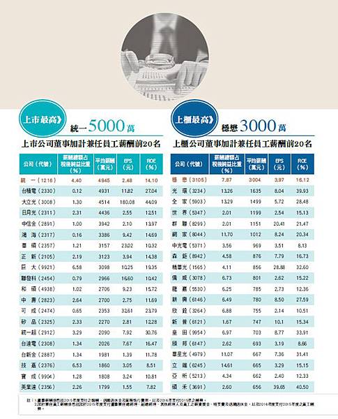 2014年上市公司平均每位董監事酬金最高前十名出爐,排名第一是上市公司中賺錢股王的台積電,平均每位董事可分得5,513萬元,其次是中信金的3,851萬元、統一超商的3,652萬元。但是公司一直處於營運虧損困境,董事依舊坐領酬金的公司,則有旺宏、錸德、華映、東森及正達等逾70家上市公司。