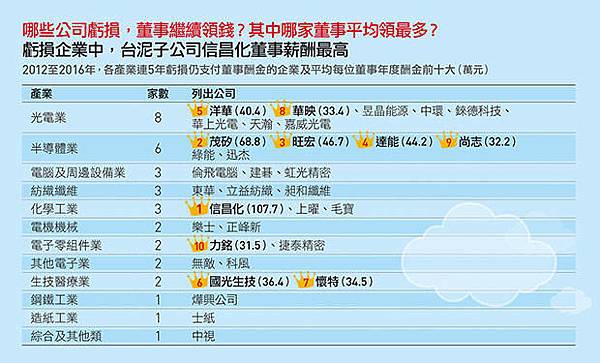 此外像是不只虧損一年的宏達電(2498),去年公司再虧損30.73億元,每人董事酬金依舊照領406萬元以上,紡織股東華(1418)去年每股虧損逾3元,公司董事酬金就拿112萬元加計員工薪資後更達206萬元,龍燈-KY公司同樣每股虧損2.07元,光董事酬金就拿196萬元。