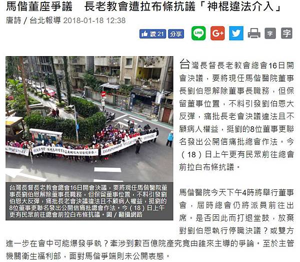 台灣長督長老教會總會16日開會決議,要將現任馬偕醫院董事長劉伯恩解除董事長職務,但保留董事位置,不料引發劉伯恩大反彈,痛批長老會決議違法且不顧病人權益,挺劉的8位董事更聯名發出公開信痛批總會作法。今(18)日上午更有民眾前往總會前拉白布條抗議。