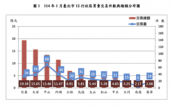 各行政區交易總額依序由信義區19.38億元、大安區15.65億元及中山區13.46億元位居前3名;總額最少為萬華區,僅2.08億元,總額最高的信義區與最低的萬華區,差約8.32倍。交易總額增幅最大為大同區,較12月增加28.97%;減幅最大為南港區,較12月減少75.42%,一個月僅成交5件,其他如大同、萬華、士林、中正、松山、文山等,一個月也成交不到30件。