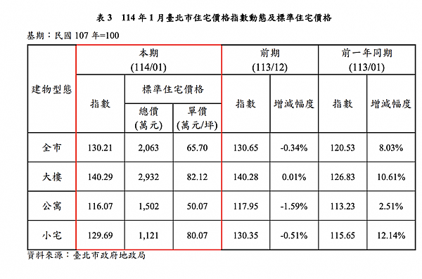 在住宅價格指數部分,114年1月全市住宅價格指數130.21,較12月130.65下跌0.34%,但仍較前一年同期120.53上升8.03%;標準住宅總價2063萬元,標準住宅單價每坪65.70萬元,均較上個月微幅下跌。