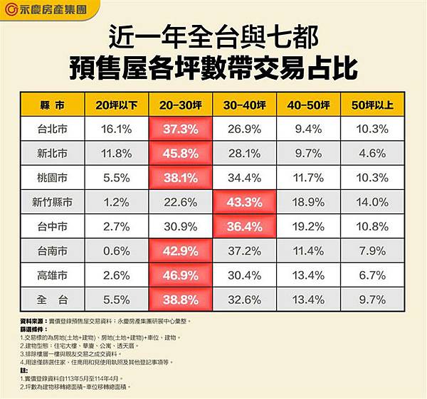 據永慶房產集團統計,近一年六都與新竹預售交易中,台北市30坪以下占比為53.4%,其中20坪以下占比16.1%;新北市30坪以下占比57.6%,20坪以下占比11.8%。南部方面,高雄與台南20-30坪占比分別超過四成。中部方面,台中市30坪以上占比66.4%;新竹縣市更高達75%,其中30-40坪占比43.3%,為全台最高。